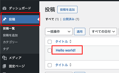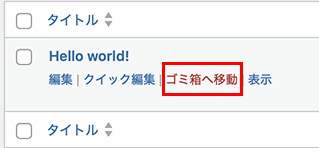 記事のタイトル名付近にカーソルを持っていくと表示される「ゴミ箱へ移動」をクリックして記事を削除します。
