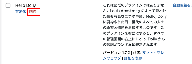 「Hello Dolly」サイト運営に関係の無いププラグインなので、プラグイン名下にある「削除」をクリックして削除しましょう。