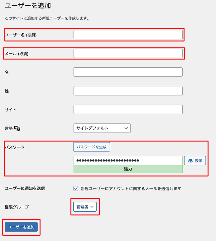 • ユーザー名 (必須):メールアドレスや、サイトに関するものなど特定されやすい文字列は避け、なるべく複雑なものを設定しましょう。